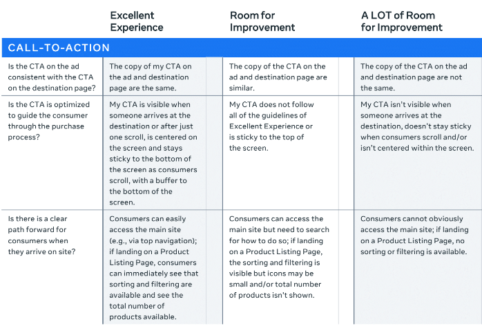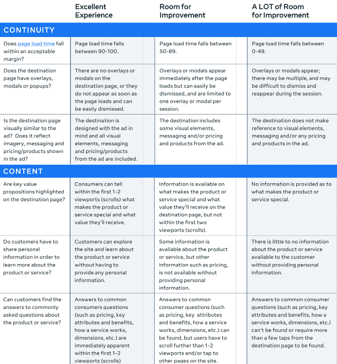 Meta a créé une matrice qui vous permet d’identifier rapidement si votre page de destination est suffisamment optimisée pour améliorer le taux de conversion depuis vos annonces publicitaires :