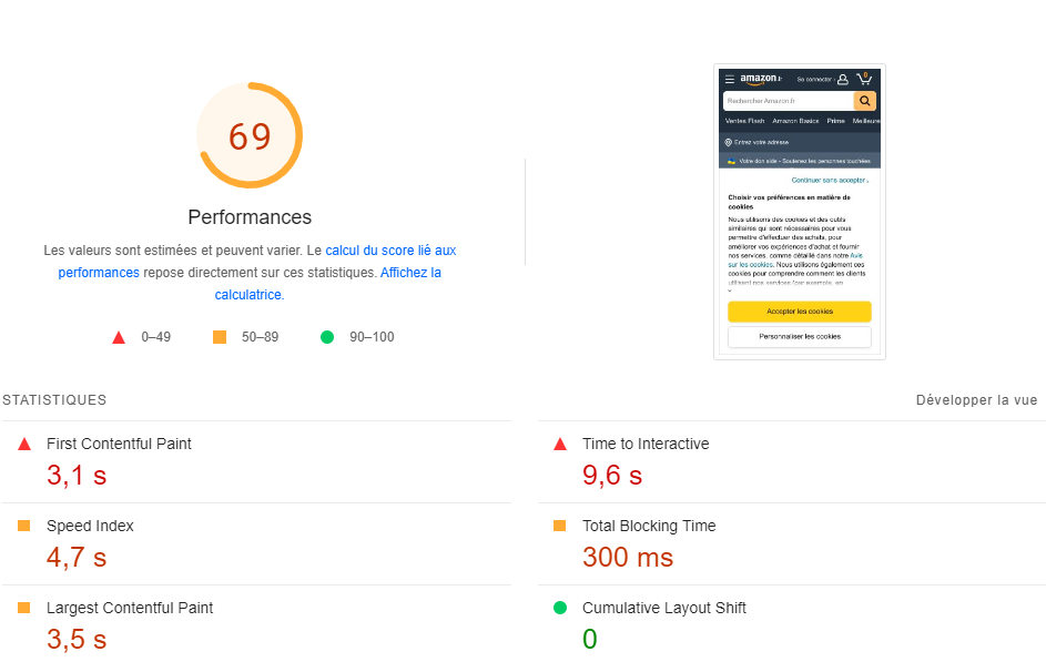 Une étude Google de 2019 montrait déjà que 53% des utilisateurs quittaient un site internet si celui-ci mettait plus de 3 secondes à se charger. La vitesse de chargement de la landing page a un impact majeur sur les performances de vos campagnes SEA et SMA, avec une hausse du taux de rebond et des coûts par vue de page de destination qui explosent. Utilisez un outil de test de vitesse de chargement afin de détecter les axes d’optimisations techniques à mettre en place sur votre site. De nombreux outils gratuits, comme Google PageSpeed Insights, vous indiqueront le score de chargement de votre page de destination sur mobile et sur desktop, ainsi que les priorités d’action. Quelques optimisations techniques courantes peuvent déjà être citées :