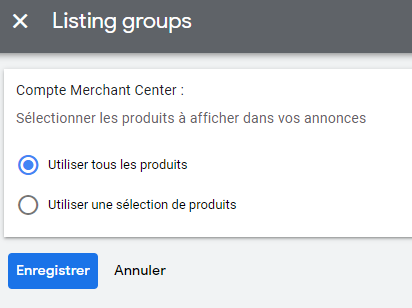Quand vous paramétrez vos groupes d’éléments dans Performance Max, choisissez “Utiliser une sélection de produits”.