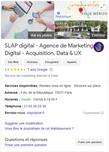 Google My Business est la porte d’entrée au positionnement local. C’est généralement elle qui permet d’afficher les informations de votre entreprise sur les résultats de recherche et elle est également mise en avant lorsqu’une recherche est effectuée sur Google dans une zone géographique donnée.