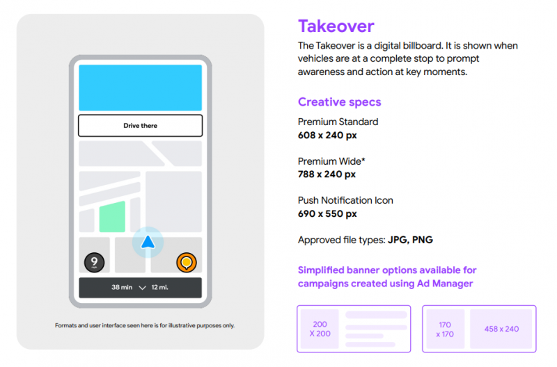 Une bannière Takeover s’affiche lorsque les conducteurs s’arrêtent complètement pendant plusieurs secondes. Elle disparaît dès qu’ils redémarrent pour poursuivre leur itinéraire.Les Takeovers proposent aux conducteurs d’obtenir l’itinéraire vers votre établissement, d’en savoir plus à son sujet, d’enregistrer votre adresse ou de sauvegarder une offre dans leur boîte de réception.
