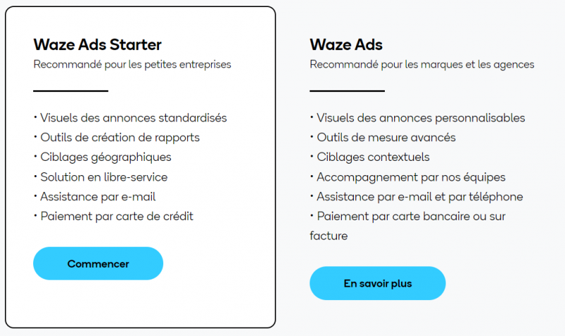 Waze propose actuellement deux plans tarifaires pour les annonceurs qui souhaitent se lancer sur Waze Ads.